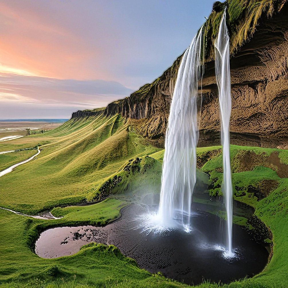 Experience the awe-inspiring beauty of Iceland with this ultra-high-resolution digital image of Seljalandsfoss Waterfall—captured and enhanced to perfection. This hyper-realistic photo showcases the cascading falls glowing under a pastel dusk sky, with lush green cliffs and reflective pools below.